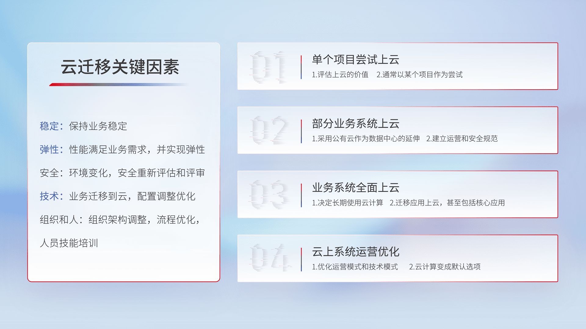 结合实际业务,,从规划设计、、、、云平台选型、、云原生改造、、、、数据迁移、、、、集成交付,,,迁移全过程为客户识别最佳上云路径,,,,做好风险识别管理,,设计网络架构、、、身份权限、、、、安全审计合规、、操作审计、、、日志审计、、监控告警策略、、、、多站点容灾设计等,,对云上基础设施进行整体规划,,,提升IT治理水平,,以满足弹性、、高可用、、、、高性能的需求。。