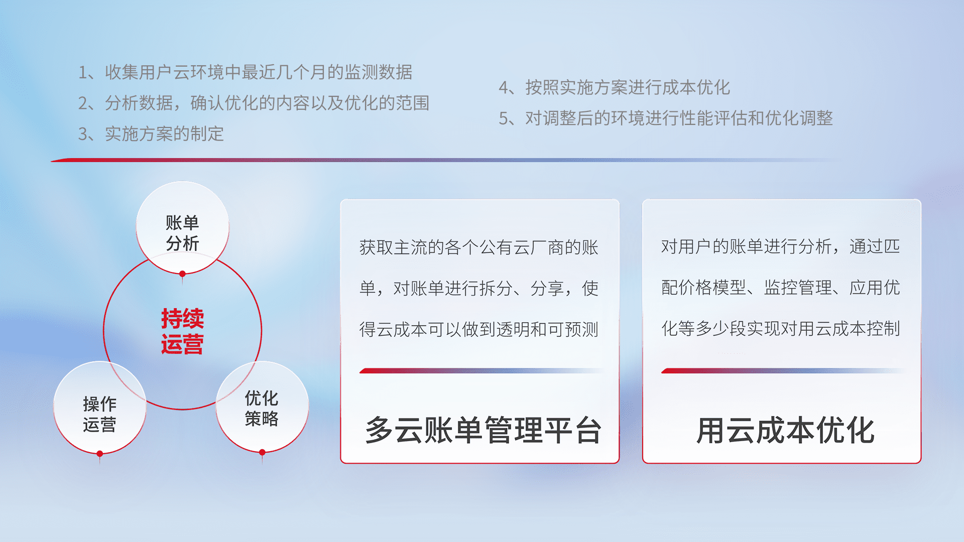 通过多云纳管,,,以统一的资源数据模型把客户的云资源进行抽象和封装,,进而实现对多云资源的统一操作,,保障云资源管理的可靠性、、稳定性与可用性。。。。量身定制化运维内容,,,,配置、、、、开发运维、、、、补丁管理、、、备份、、、监控、、认证和访问管理、、、、审计和日常巡检等,,,,保障在用云过程中的可靠度,,,稳定度以及高可用率。。。