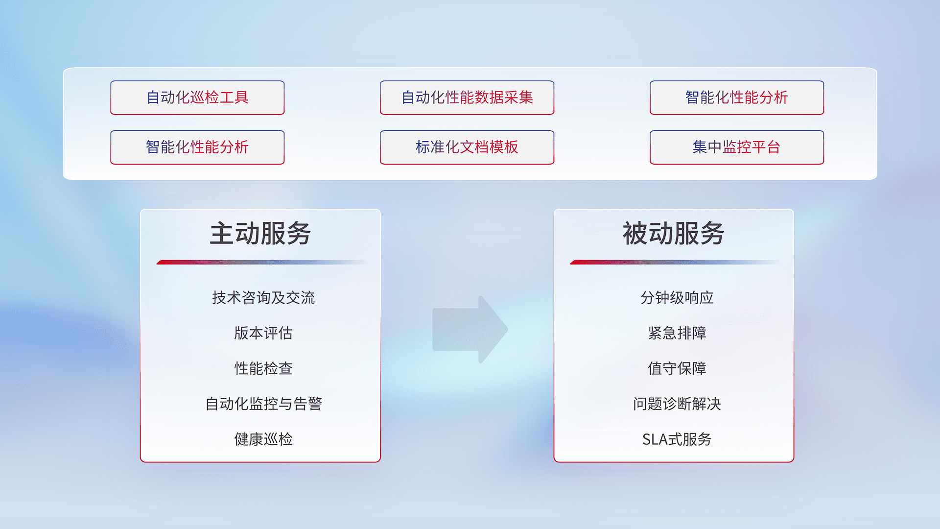 智能化工具和标准化文档,,,,保障服务质量,,,提供主动服务(包含技术咨询、、、版本评估、、、、性能检查、、、自动化监控与告警、、、、健康巡检)和被动服务包含(分钟级响应、、、紧急排障、、、值守保障、、、问题诊断解决、、SLA服务)。。